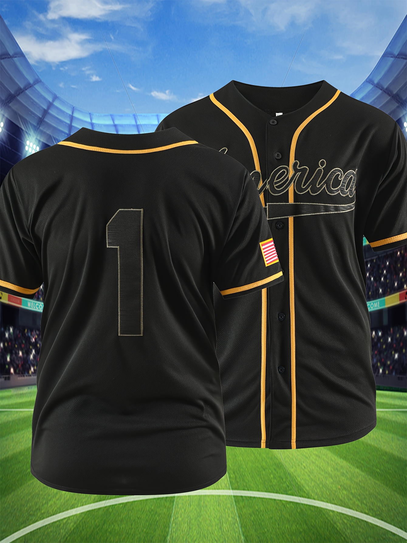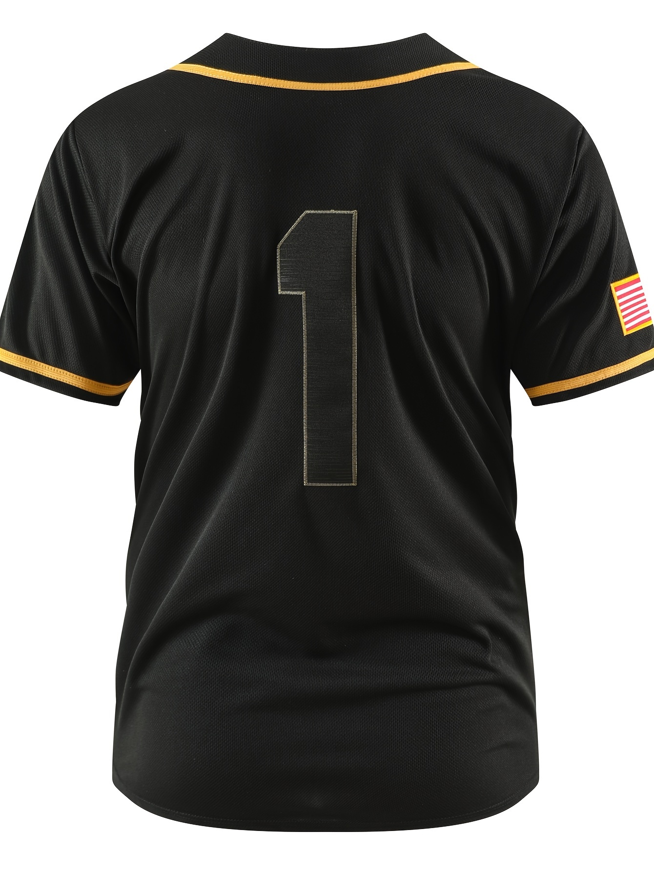 Men's #1 Black Baseball Jersey - Classic Embroidered Letter Design, Breathable Button-Up Short Sleeve Shirt for Training & Competition