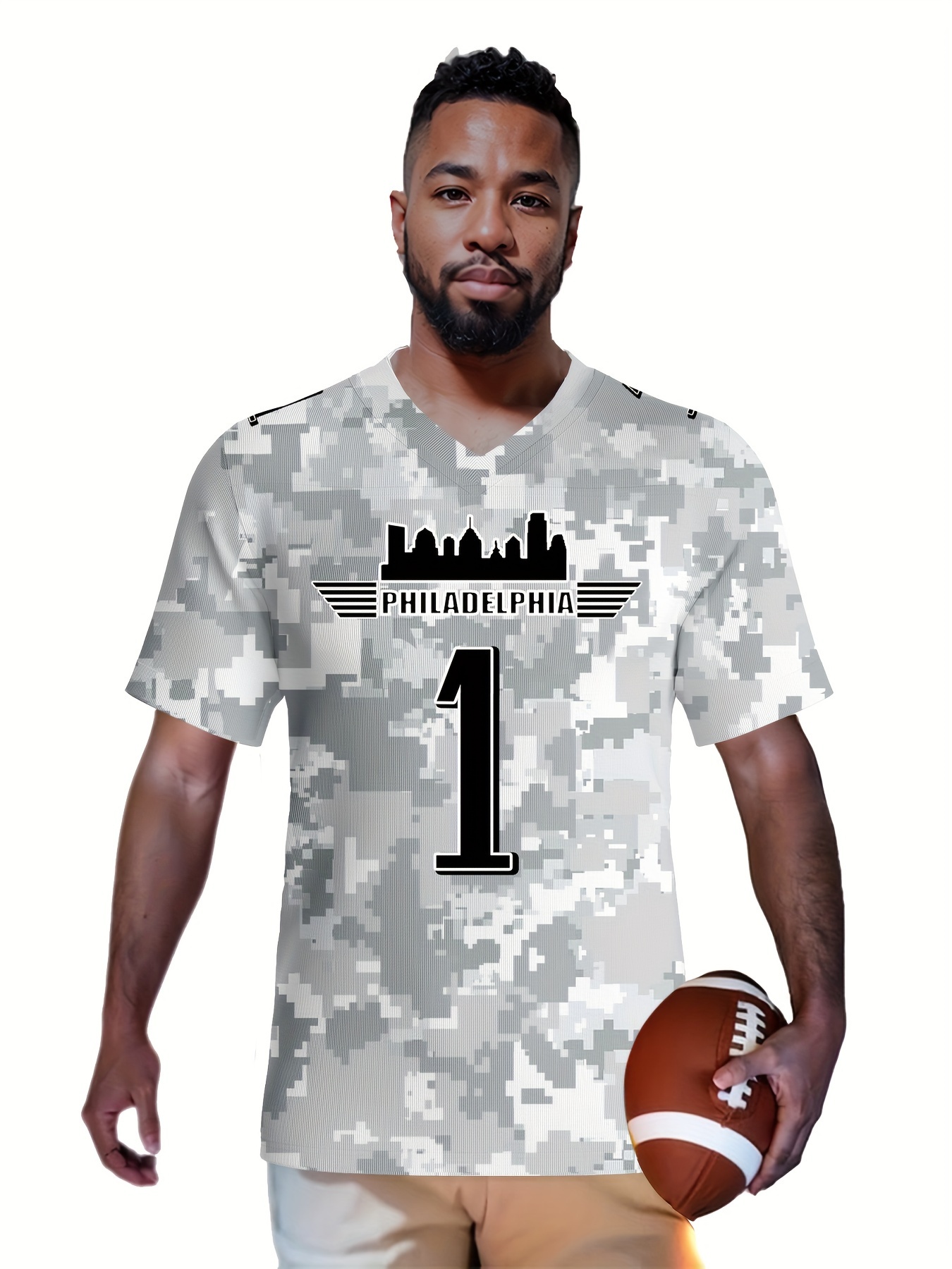 Men's Arctic Camo Philadelphia #1 Polyester Football Jersey, Men V-Neck Sports Shirt With Slight Stretch, Breathable Casual Knit Fabric For All Seasons, Loose Fit Adult, Fans Gift Men, For Training Competition Festival Party Outdoor Sports