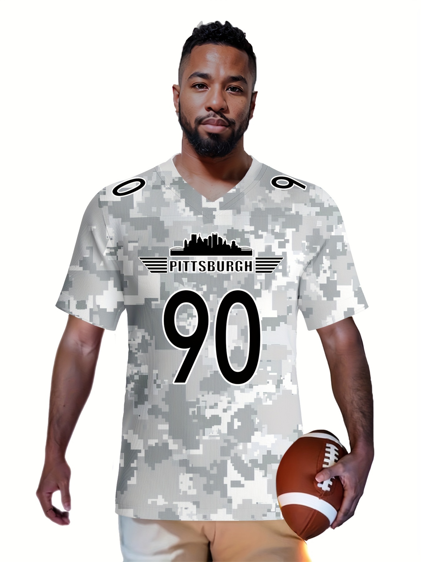 Men's Arctic Camo Pittsburgh #90 Polyester Football Jersey Men, Men V-Neck Sports Shirt With Slight Stretch, Breathable Casual Knit Fabric For All Seasons, Loose Fit Adult, Fans Gift Men, For Training Competition Festival Party Outdoor Sports