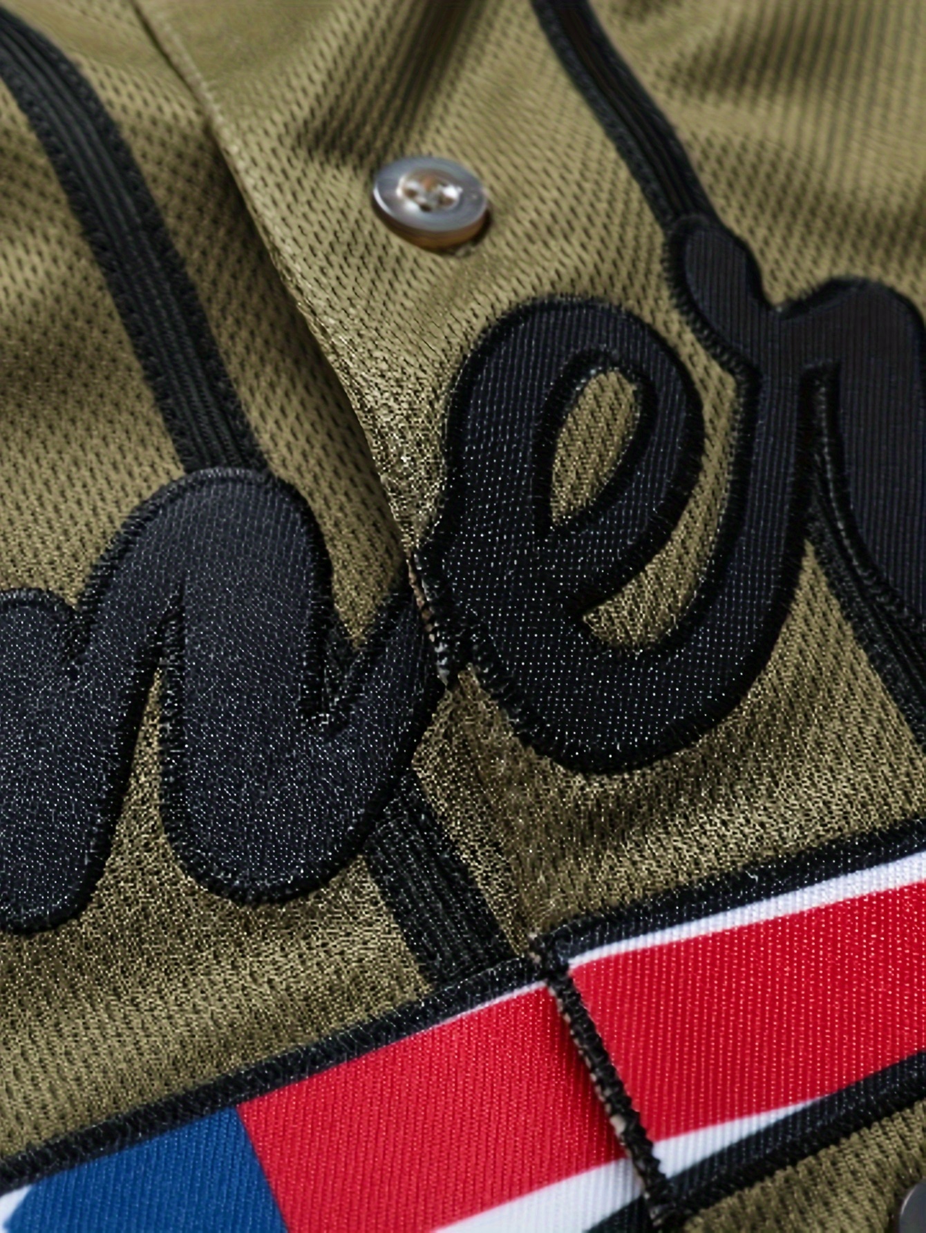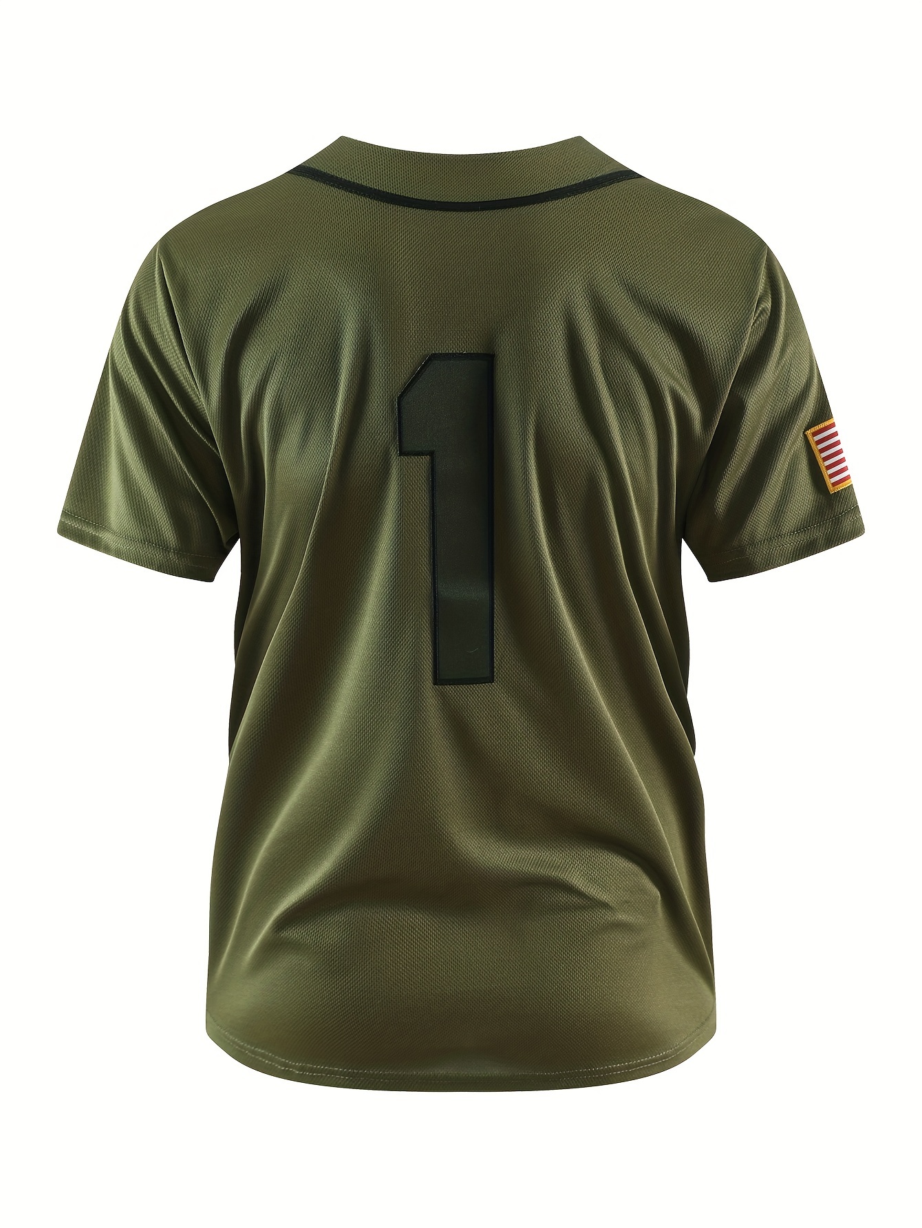 Men's Green # 1 Baseball Shirt, Classic Letter Embroidery Design, Button Style Short Sleeve Breathable Shirt, Used For Training And Competitions