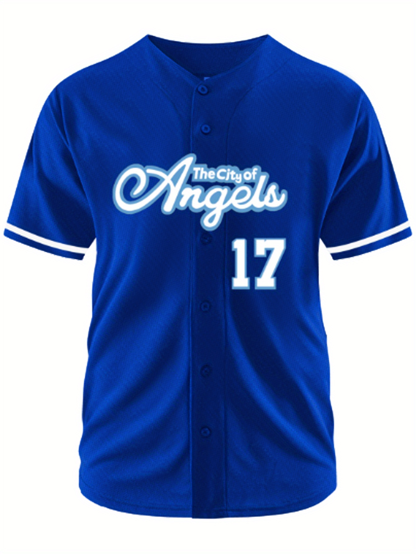 Men's Royal Blue #17 Baseball Jersey - Retro Embroidered "City of Angels" Design, Breathable Button-Up V-Neck, Loose Fit for Training, Games & Casual Wear | All-Season Comfort, Machine Washable, Outdoor Clothing | Sporty Look | Embroidered Detailing