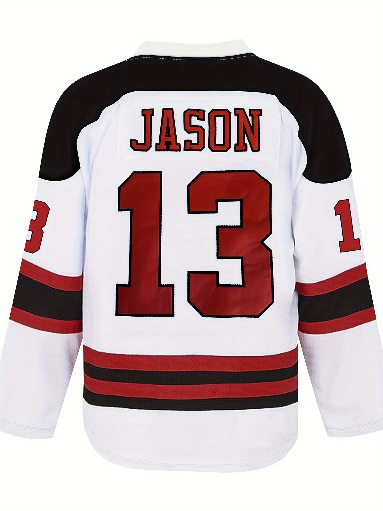 Men's #13 Jason Embroidered Ice Hockey Jersey - White & Red Striped Retro Classic V-Neck Sweatshirt, Breathable Polyester, Perfect for Sports, Casual Streetwear & Fan Events, Hockey Stocking Stuffers