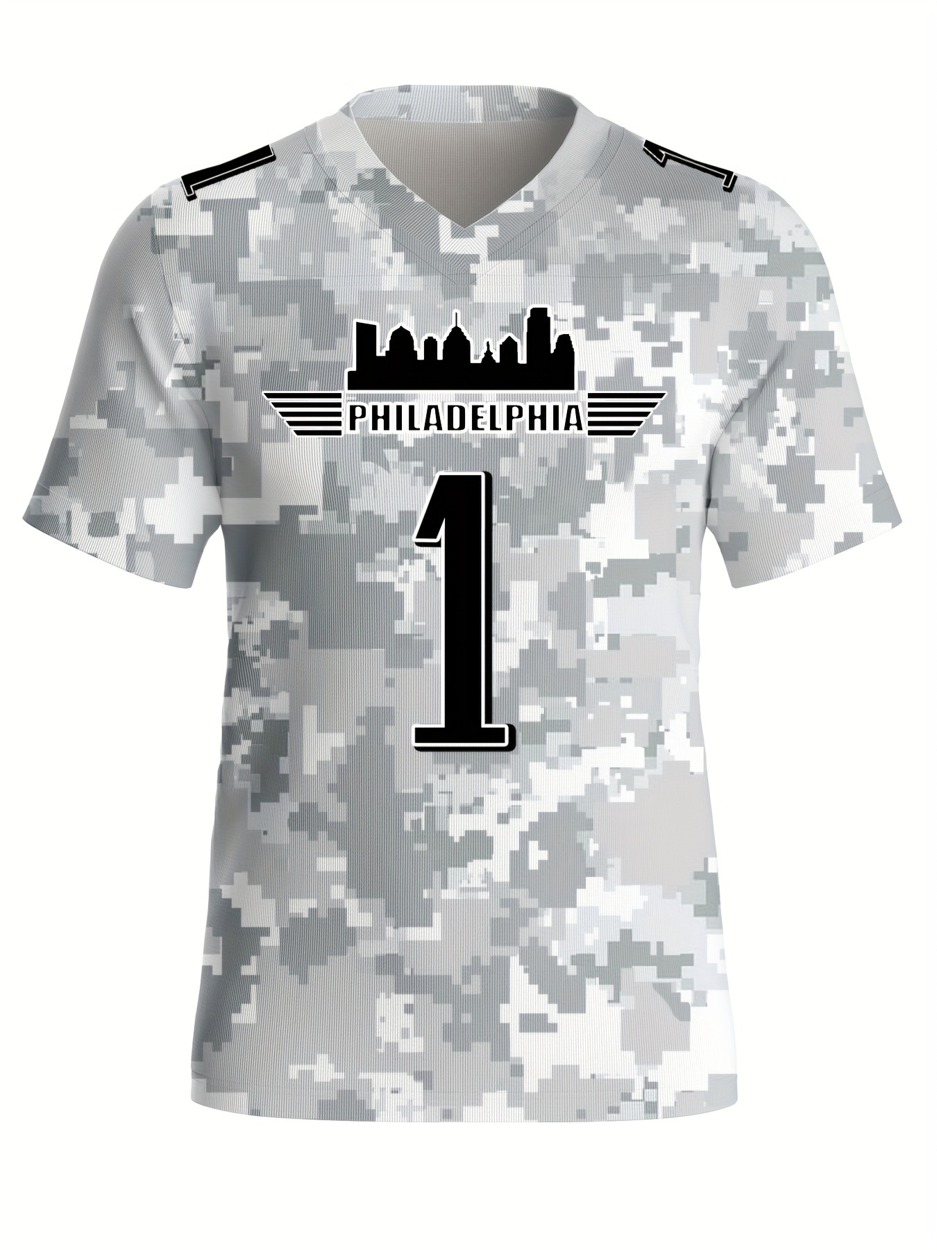 Men's Arctic Camo Philadelphia #1 Polyester Football Jersey, Men V-Neck Sports Shirt With Slight Stretch, Breathable Casual Knit Fabric For All Seasons, Loose Fit Adult, Fans Gift Men, For Training Competition Festival Party Outdoor Sports