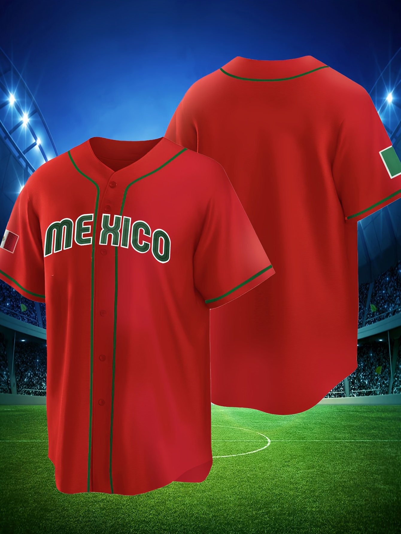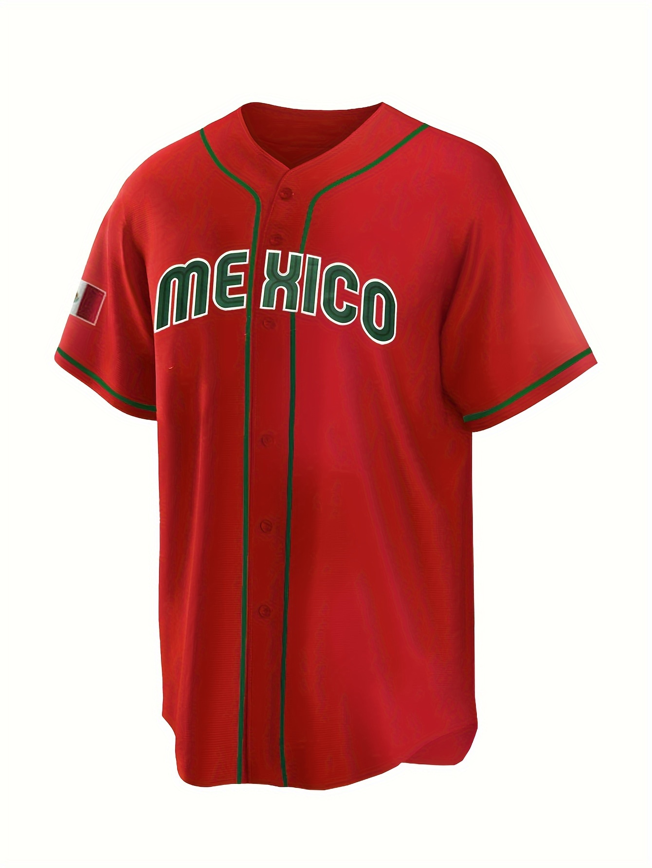 Men'S Polyester Baseball Jersey, Embroidered 'MEXICO' Lettering, V-Neck, Slight Stretch, Loose Fit, for Casual & Athletic Wear, Four Seasons Sports Shirt for Adults & Teens